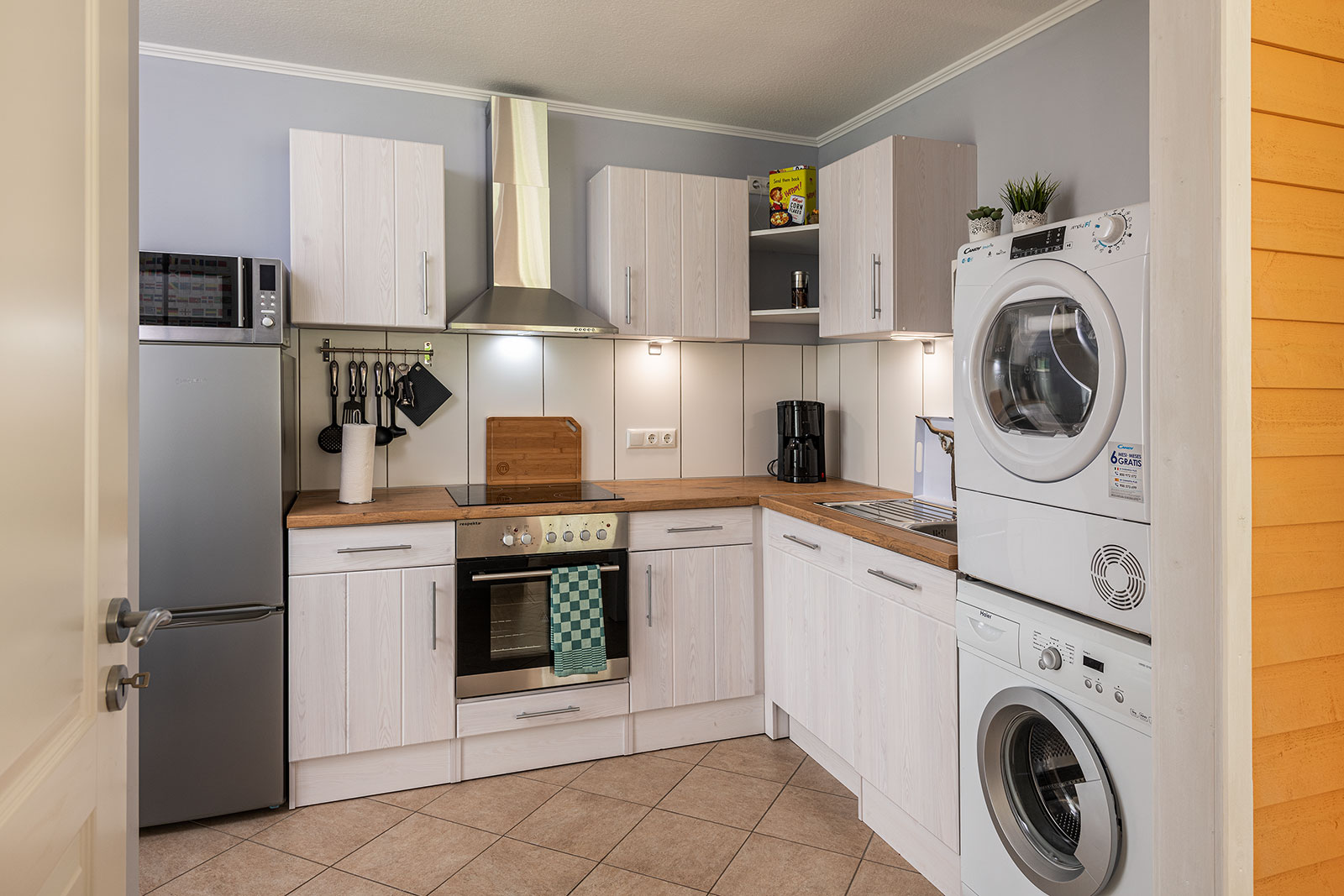 Die Küche ist modern und praktisch eingerichtet mit einem Herd mit Backofen und Cerankochfeld, Kühlgefrierkombination, Mikrowelle, Spülmaschine, Kaffeemaschine, Eierkocher, Toaster, reichhaltig Geschirr, Besteck, Töpfe und Pfannen, Waschmaschine und Trockner.